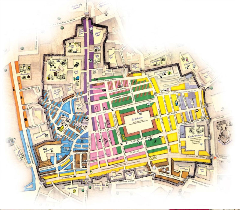 Le grand bazar d’Istanbul est organisé par quartiers, regroupant chacun un certain type d’artisanat : bijoux, tapis, textiles, mosaïques, argenterie etc. Au centre du Grand Bazar Istanbul se situe le Bedesten. C’est est une sorte de marché aux puces où s’entassent d’innombrables antiquités, armes anciennes, vieux bijoux en argent, en or, parures, vaisselles, argenteries etc…